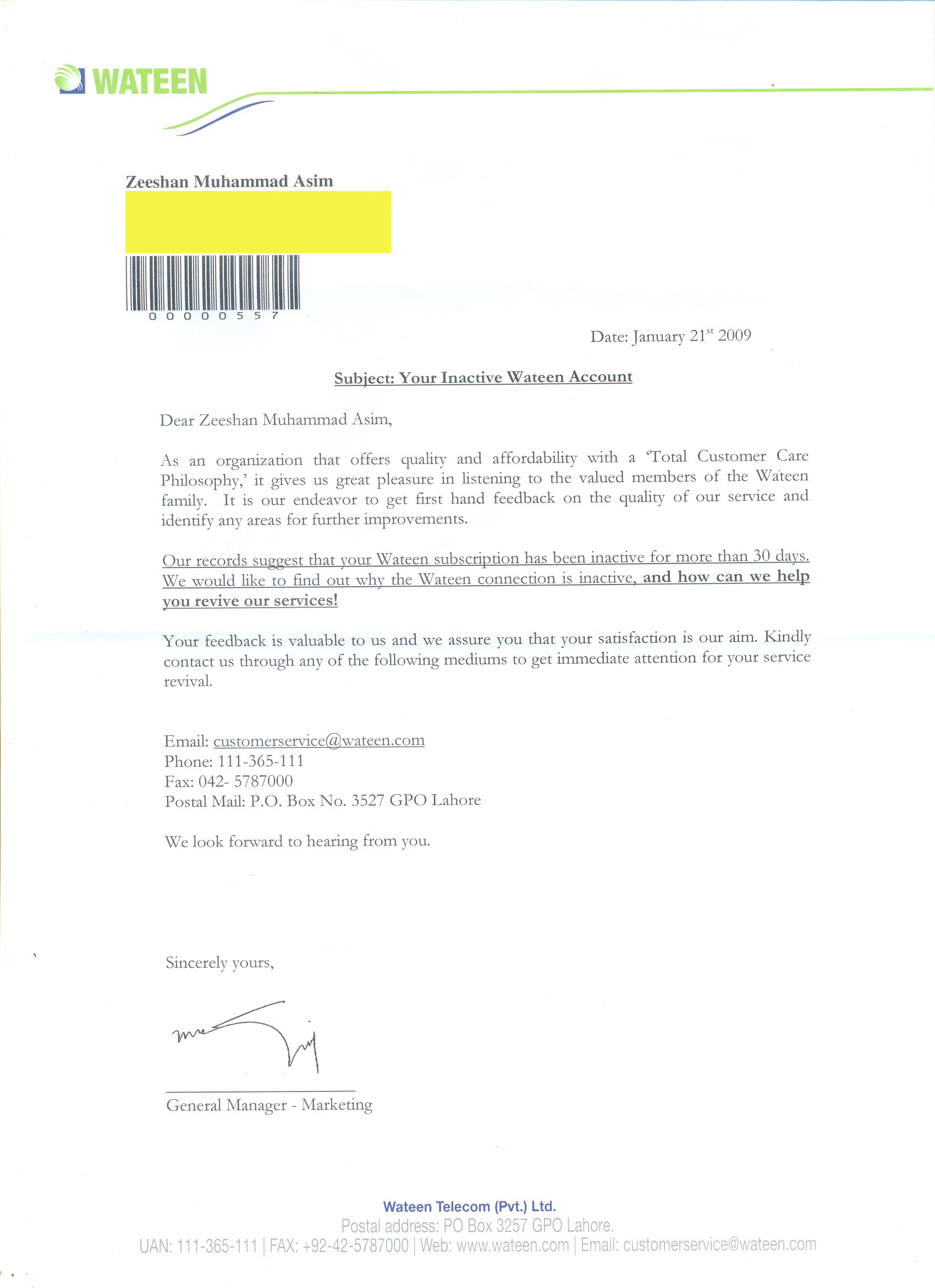 After receiving and reading through the letter that is dated 21st Jan 2009 and dispatched on 23rd Jan 2009, I am pretty sure that the people at Wateen do not know how to operate things especially their billing, marketing and support departments.